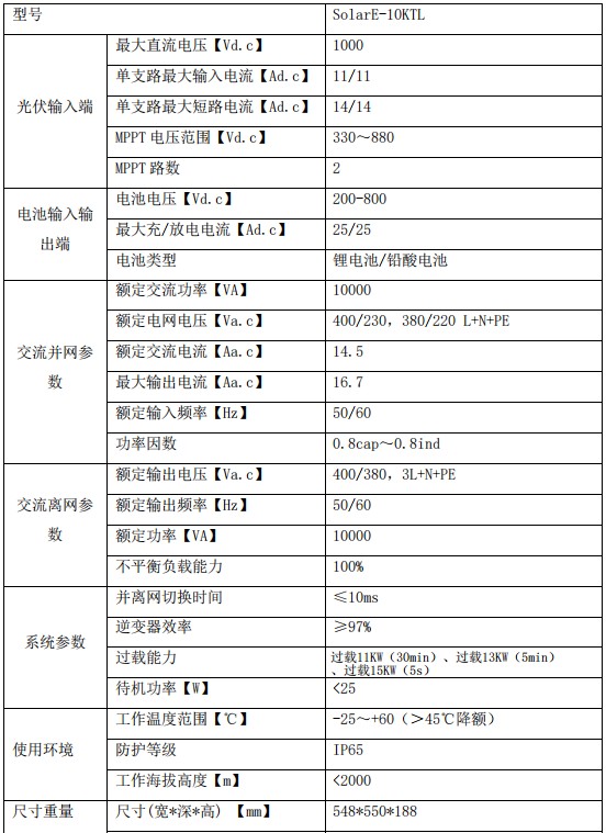 光储一体机产品,支持光伏、电池、并网、负载四路接口,集成并离网切换功能,支持离网、并网模式的不间断切换,离网状态下满功率输出,支持100%不平衡负载接入,可匹配空调等感性负载,负载适应性好。