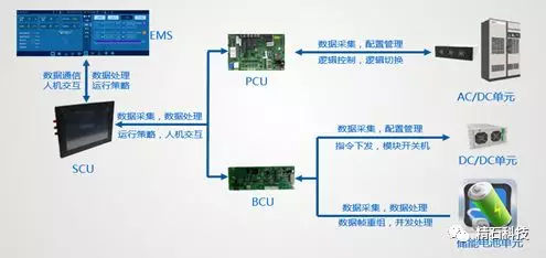 “集”主要指集成化,将PCS系统集成了BCU、PCU、SCU和EMS单元,BCU对电池和DC/DC数据采集和和数据处理;PCU采集AC/DC单元数据进行上传给SCU,并根据SCU指令进行逻辑控制。SCU与BCU、PCU、电表等设备进行通讯,实现数据处理,进行策略控制及人机交互;同时,内部还集成EMS系统。